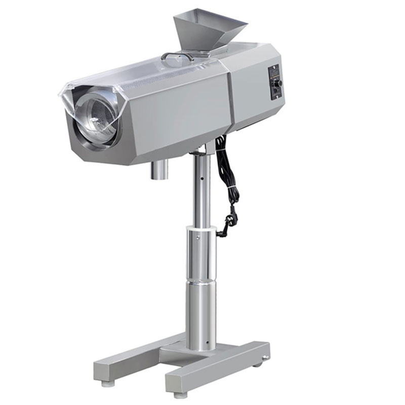 This machine adopts AC brushless motor to achieve stepless speed regulation, which can meet the requirements of different output and different drugs for removing powder. The height and angle of the feeding and discharging ports can be adjusted arbitrarily within a certain range to meet different working requirements; the bottom of the machine base is equipped with casters, so that the machine can be conveniently moved to the working place. This machine consists of feeding hopper, power box, sieve box, sieve drum, blowing device, discharge port, frame, speed control device, transmission mechanism and other parts, the sheet from the feeding hopper to join the sieve drum, the sieve drum is driven by the power box composed of AC speed motor and deceleration mechanism and rotates, the sheet is transmitted to the discharge port along the spiral plate inside the sieve drum in the lower part of the circumference, the mesh on the drum carries out the mild grinding of the sheet and compressed air blowing device. Compressed air blowing device on the surface of the sheet close to the continuous blowing, dust in the jet airflow, centrifugal force and gravity under the action of the sieve drum for the ‘film’ and ‘powder’ separation, while the dust with the suction airflow sucked into the dust collection device, and ultimately remove the surface of the piece of adsorption of the dust and burrs. The dust is sucked into the dust collection device with the suction airflow. The working height and angle of the inlet and outlet can be adjusted with the help of the lifting bar and locking handle.